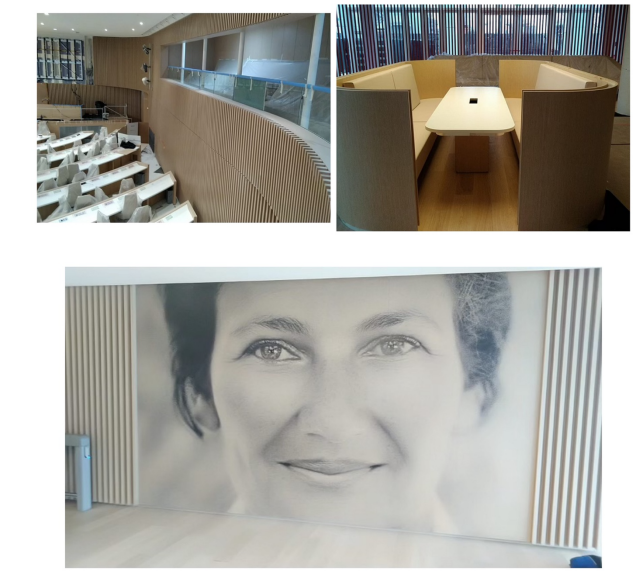 Chantier : Amenagement de l’hémicycle et des espaces d’accueil 2 Rue Simone Veil 93400 SAINT OUEN Travaux effectués : Habillages, panneaux acoustiques textiles, agencement